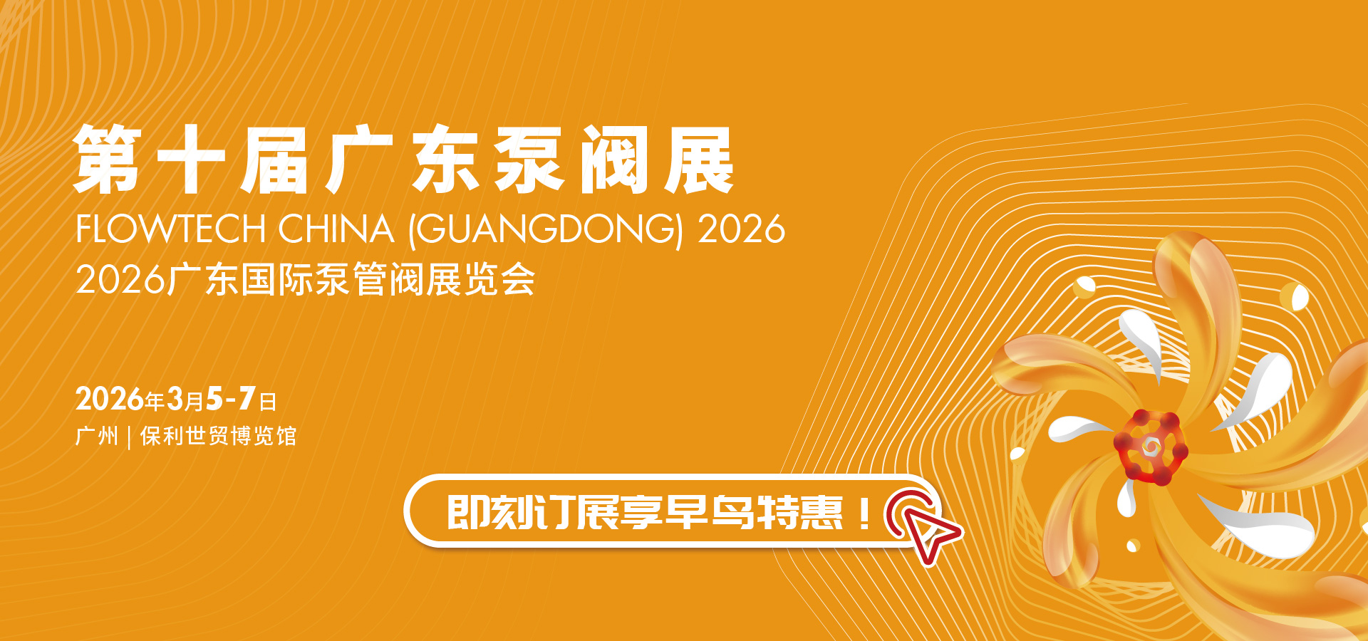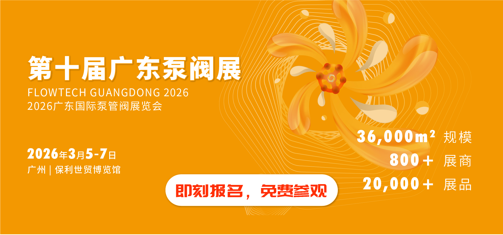 第十屆廣東泵閥展將于2026年3月5-7日在廣州丨保利世貿(mào)博覽館盛大啟幕!展覽面積達(dá)36,000平方米,預(yù)計(jì)將匯聚超20,000名專業(yè)觀眾,吸引800余家優(yōu)質(zhì)展商踴躍參展。